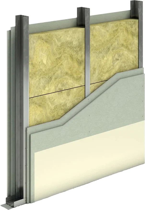 Двухслойная перегородка обычно состоит из двух независимых рядов вертикальных стоек — часто из оцинкованной стали или дерева — разделенных небольшим воздушным зазором для предотвращения прямой передачи вибраций и звуковых волн.В двухслойной конструкции два ряда стоек расположены со смещением или на некотором расстоянии друг от друга, так что они не соприкасаются. Между стойками помещаются плиты из базальтовой ваты.