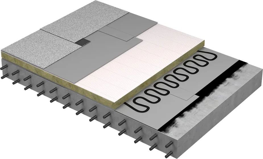 Основой всей системы является несущий настил, который может быть выполнен из стали, бетона или дерева. В коммерческих проектах, где используется каменная вата, наиболее распространенным является настил из гофрированной стали. Конструкция настила должна выдерживать собственный вес, а также динамические нагрузки от снега, дождя и движения техники во время технического обслуживания. 2. Пароизоляция и грунтовка