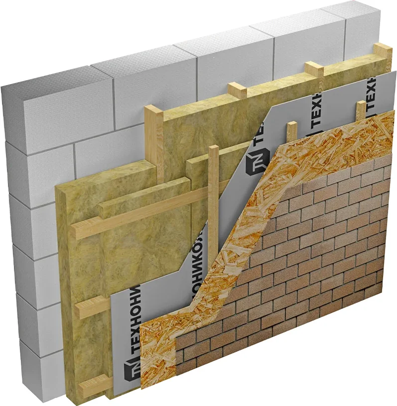 В высокоэффективных системах каменная вата может укладываться в два слоя со смещенными швами для устранения тепловых мостов.