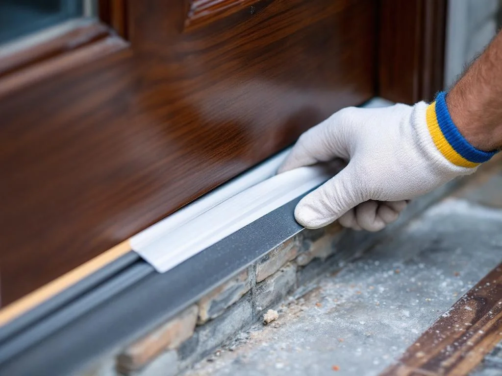 Для дополнительной защиты от насекомых и сквозняков устанавливается уплотнитель нижней части двери. Он дополнительно закрывает зазор между дверью и порогом. Если такой уплотнитель установлен, убедитесь, что он в хорошем состоянии. Если нет - нужно заменить или установить его, если на предыдущих этапах не удалось уменьшить зазор между порогом и дверным полотном.Шаг 5: теплоизоляция дверной коробки
